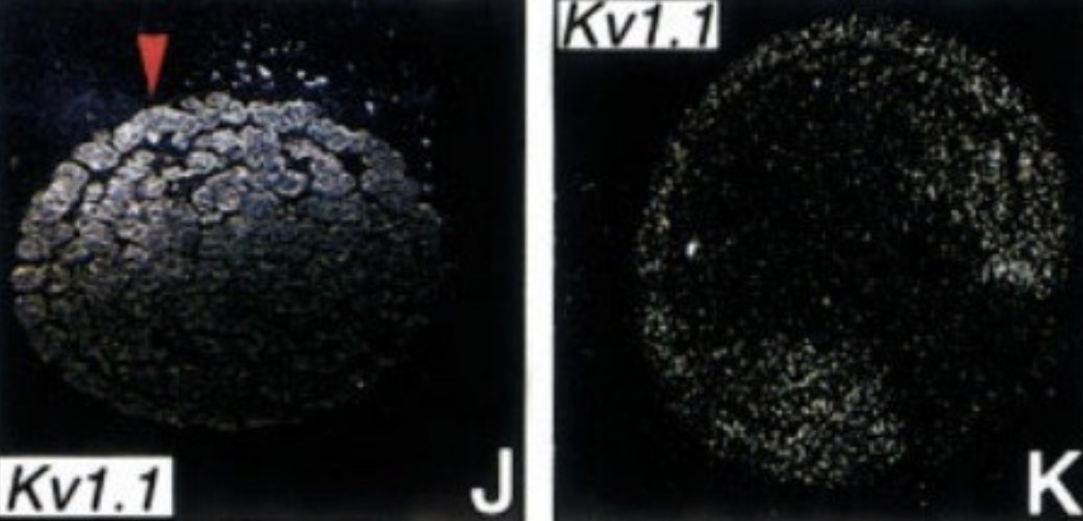 kcna1 (potassium channel, voltage gated shaker related subfamily A, member 1) gene expression in Xenopus laevis embryo, detected by radioactive in situ hybridization, NF stage 5 (16-cell) inJ, left) and in bisected NF stage 10 embryo (K, right).