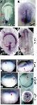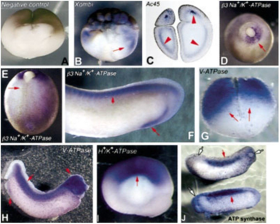 Figure 2. Ion pump genes expressed in Xenopus. A variety of known ion channel and pump genes are also expressed during early Xenopus embryogenesis. Clones with specific expression patterns are shown here at representative stages. A: Sense probe controls show no signal. B: A probe for the maternal gene Xombi shows that whole-mount in situ hybridization can detect vegetal mRNA localization when it is present (arrow). C: Sectioning perpendicular to the animalegetal axis of a four-cell embryo stained in whole-mount in situ hybridization with a probe for the Ac45 V-ATPase subunit EST and embedded in JB4 shows (arrowheads) nuclear mRNA in the center of cells, as well as cytoplasmic mRNA. D,E: The neural β3 subunit of the Na+/K+ ATPase is detected at st. 11 in cells around the ventral margin of the blastopore (arrows). F: At st. 32, it is detected in the neural tube and in the posterior gut (arrows). G: Maternal mRNA encoding a subunit of the H+ pump (V-ATPase) is present throughout the animal hemispheres of the four-cell embryo (arrows). H: It is later expressed throughout the neural tube and head of the tail bud stage embryo (arrows). I: mRNA for the H+/K+-ATPase (ion exchanger) is present in a more laterally restricted region of the two-cell embryo (arrow). J: mRNA for the 16-kDa proteolipid component of the H+ synthase is expressed in bilateral stripes of deep tissue ventral to the neural tube, demonstrating that signal along the length of the neural tube and in the head is not obligatory or artifactual at tail bud stages. Red arrows indicate expression; white arrows indicate regions of no detectable expression. G is a photograph of the internal surface of two blastomeres of a four-cell embryo manually separated after in situ hybridization. I is a view of the internal surface of one blastomere of a two-cell embryo.