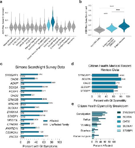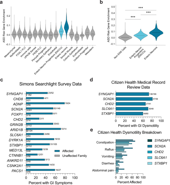 Fig. 1. hcASD gene expression is enriched in ENS cells and individuals with pathogenic variants in these genes experience GI issues.a Enrichment of 252 hcASD genes is higher in Enteric Neuron Progenitors (ENCCs) and Enteric Neurons compared to all other cell types in single-cell RNA-sequencing data from the human prenatal gut26. b 252 hcASD genes are enriched in ENCCs and Enteric Neurons compared to all other Non-ENS cells in the human prenatal gut. A one-way Kruskal-Wallis test was performed, followed by Wilcoxon rank-sum tests and Bonferroni adjustment for multiple comparisons. Non-ENS vs ENCCs padj = 5.20e91, Non-ENS vs Enteric neurons padj = 0, ENCCs vs Enteric Neurons padj = 5.90e81. ce The number of individuals affected and the total number of people surveyed is tallied at the end of each bar. c Simons Searchlight data documenting the percentage of affected individuals (teal bars) and their unaffected family members (gray bars) who reported GI issues in caregiver surveys. d Citizen Health medical record data showing the percentage of individuals with a SYNGAP1, SCN2A, CHD2, STXBP1 or SLC6A1 genetic variant with medical record diagnoses related to GI dysmotility. e Citizen Health medical record data by variant for dysmotility phenotypes including constipation, abdominal pain, and diarrhea.