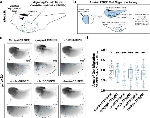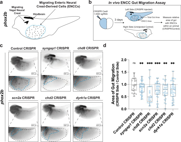 Fig. 2. hcASD gene depletion in vivo causes ENCC migration defects.a Schematic of phox2b staining in NF stage 40 animals to mark enteric neural crest-derived cells (ENCCs, enteric neuron progenitors) in the gut, circled by a blue dashed line. phox2b also labels the hindbrain region and other migrating vagal neural crest cells. b Unilateral mutants were made by injecting the Cas9 protein and an sgRNA targeting an hcASD gene into one cell at the two-cell embryonic stage. Three days later, injected embryos were stained and ENCC area and gut area was measured on each side of the animal and compared to quantify relative gut area (CRISPR side / Control side) of migration. c Individual CRISPR mutagenesis of hcASD genes syngap1, chd8, scn2a, chd2, or dyrk1a reduce the area of ENCC migration in the gut compared to control mutagenesis of pigmentation gene slc45a2. d Area of gut migration quantification by target gene. Control in gray, hcASD genes in blue. A two-way Kruskal-Wallis test was performed followed by Wilcoxon matched-pairs signed rank test to compare the CRISPR side to the control side within each animal and a Holm-dk test to adjust for multiple comparisons. Control (N=24, padj = 0.9248), syngap1 (N=38, padj = 0.0046), chd8 (N=25, padj = 0.001), scn2a (N=33, padj = 0.001), chd2 (N=31, padj = 0.0011), dyrk1a (N=38, padj = 0.0011). All samples are independent biological replicates from the same mating pair. In the box plot, whiskers show minimum and maximum values, box represents the 25th and 75th quartiles, and the center line describes the median. Source data are provided as a Source Data file.