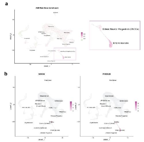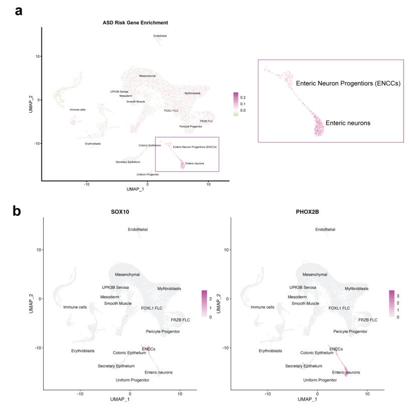 according to enrichment of hcASD gene module scores. Enteric neurons and ENCCs are outlined in a red