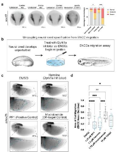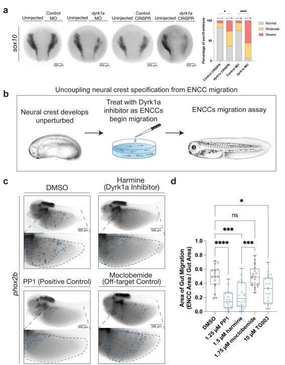 later ENCC migration. Related to Figure 3. (a) Perturbation of dyrk1a with either CRISPR or morpholino (MO) injection results in an increased proportion of moderate and severe early (stage 15) neural crest phenotypes compared to controls. Migratory neural crest was visualized with RNA in situ hybridization staining for sox10 at NF stage 15. There are significantly more moderate and severe phenotypes in dyrk1a CRISPR and MO embryos than controls (Fishers exact test, CRISPR p = 0.02, MO p < 0.0001). (b) Schematic of assay to uncouple early neural crest development disruption from later ENCC migration. Tadpoles are raised unperturbed until NF stage 25 when the vagal neural crest begins migration. They are then treated with a Dyrk1a inhibitor or control small molecule and fixed and stained at NF stage 40 to assay ENCC migration. Xenopus illustrations Natalya Zahn (2022) 70. Drug treatment illustration created by Sarah Pyle. (c) Treatment with Dyrk1a inhibitors harmine or TG003 as well as positive control Ret inhibitor PP1 lead to reduced ENCC migration separately from neural crest specification, compared to DMSO and moclobemide controls. Moclobemide is a monoamine oxidase inhibitors that controls for potential off-target inhibition of monoamine oxidase by harmine. (d) Area of gut migration quantification by condition. Controls in gray, Dyrk1a inhibitors in blue. A Kruskal-Wallis test was performed followed by Dunns test to adjust for multiple comparisons. p values are shown in which ns (not significant) indicates padj > 0.05. Compared to DMSO (N = 18), PP1 (N = 17, padj < 0.0001), harmine (N = 20, padj < 0.0002), G003 (N = 20, padj = 0.0435), and compared to moclobemide (N = 20), harmine padj = 0.0001. Source data are provided as a Source Data file.