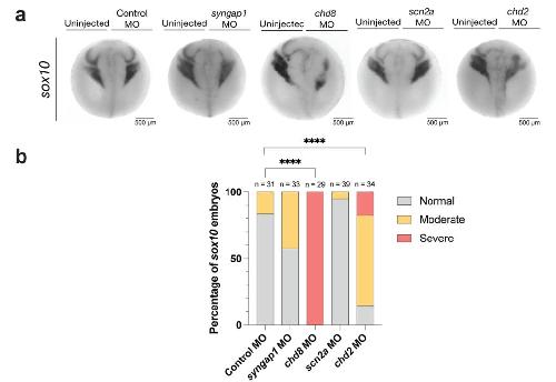 compare the proportions to the control condition, and p-values were corrected for multiple comparisons. ****p < 0.0001. There is an increased proportion of moderate and severe neural crest phenotypes in chd8 and chd2 conditions compared to controls. There is a slight increase in the proportion of moderate phenotypes in syngap1 embryos (p-value = 0.02 before multiple comparisons correction) and no effect on scn2a embryos compared to controls. Source data are provided as a Source Data file.