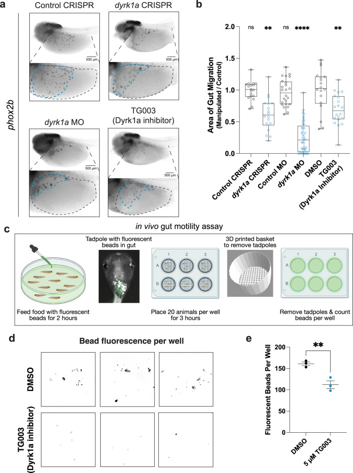 dyrk1a perturbation through CRISPR injection, morpholino (MO) injection, or Dyrk1a inhibitor (TG003) treatment all reduce the area of ENCC migration in the gut compared to control CRISPR, control MO, or vehicle control (DMSO). b Area of gut migration quantification by condition. For injection comparisons, a two-tailed Wilcoxon matched-pairs signed rank test to compare the CRISPR or morpholino side to the control side within each animal was performed. Control CRISPR (N=18, p=0.7987), dyrk1a CRISPR (N=18, p=0.0032), Control MO (N=24, p=0.1208), dyrk1a MO (N=41, p<0.0001). For small molecule treatment, a two-tailed Wilcoxon rank sum test was performed to compare DMSO (N=18) to 5M TG003-treated (N=20) embryos, p=0.0026. All samples are independent biological replicates from the same mating pair. In the box plot whiskers show minimum and maximum values, box represents the 25th and 75th quartiles, and the center line describes the median. c Schematic of the in vivo gut motility assay. At NF stage 47, tadpoles were fed food with fluorescent beads for 2h, then placed in a 6-well plate in 3D-printed baskets with 20 animals/well for 3h. Tadpoles are then removed by taking out baskets and leaving excrement with fluorescent beads behind, after which the plates were imaged to count the number of beads per well. Created in BioRender. McCluskey, K. (2025) https://BioRender.com/w82f112. d Developmental inhibition of Dyrk1a (TG003-treated beginning at NF 20) results in decreased fluorescent bead excretion compared to vehicle control (DMSO). Representative images of fluorescent beads (false-colored black). e Number of fluorescent beads per well counted for DMSO (N=3 wells, 20 tadpoles each) and TG003 (N=3 wells, 20 tadpoles each) (Dyrk1a inhibitor) wells. A one-tailed t test with Welchs correction was used to compare DMSO to 5M TG003, p=0.0091. Data are presented as mean values +/ SEM. Source data are provided as a Source Data file.