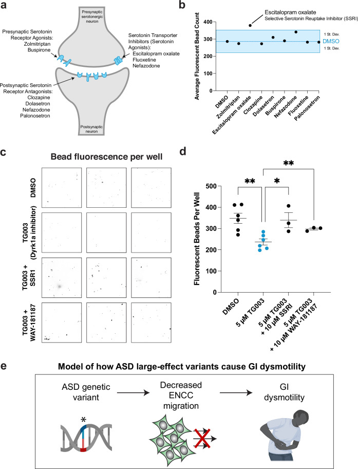 Fig. 4. Dyrk1a-associated gut dysmotility is ameliorated by acute exposure to an SSRI or 5-HTR6 agonist.a Schematic of a serotonergic synapse labeling the presumed location of action for the drugs tested. b Acute exposure of wildtype tadpoles to escitalopram oxalate (selective serotonin reuptake inhibitor, SSRI) alone increases the average number of fluorescent beads excreted by more than one standard deviation compared to the average DMSO treatment, blue. c Acute treatment of an SSRI (10M escitalopram oxalate) rescued, while a 5HTR6 agonist (10M WAY-181187) partially rescued the decreased fluorescent bead excretion from developmentally inhibited Dyrk1a (5M TG003 starting at stage NF 20) animals. d Fluorescent beads per well quantified for each treatment condition. A one-way ANOVA was performed followed by unpaired one-tailed t tests with welchs correction. Compared to TG003 treatment (N=6 wells, 20 tadpoles each), DMSO (N=6 wells, 20 tadpoles each p=0.002), TG003+SSRI (N=3 wells, 20 tadpoles each p=0.0423), TG003+WAY-181187 (N=3 wells, 20 tadpoles each p=0.0033). Compared to DMSO, TG003+SSRI p=0.4264 and TG003+WAY-181187 p=0.0462. All samples are independent biological replicates from the same mating pair. Data are presented as mean values +/ SEM. Source data are provided as a Source Data file. e Model of how hcASD gene large-effect variants could contribute to GI dysmotility. An hcASD genetic variant leads to perturbed ENCC migration and ultimately GI dysmotility. Created in BioRender. McCluskey, K. (2025) https://BioRender.com/n91b055.