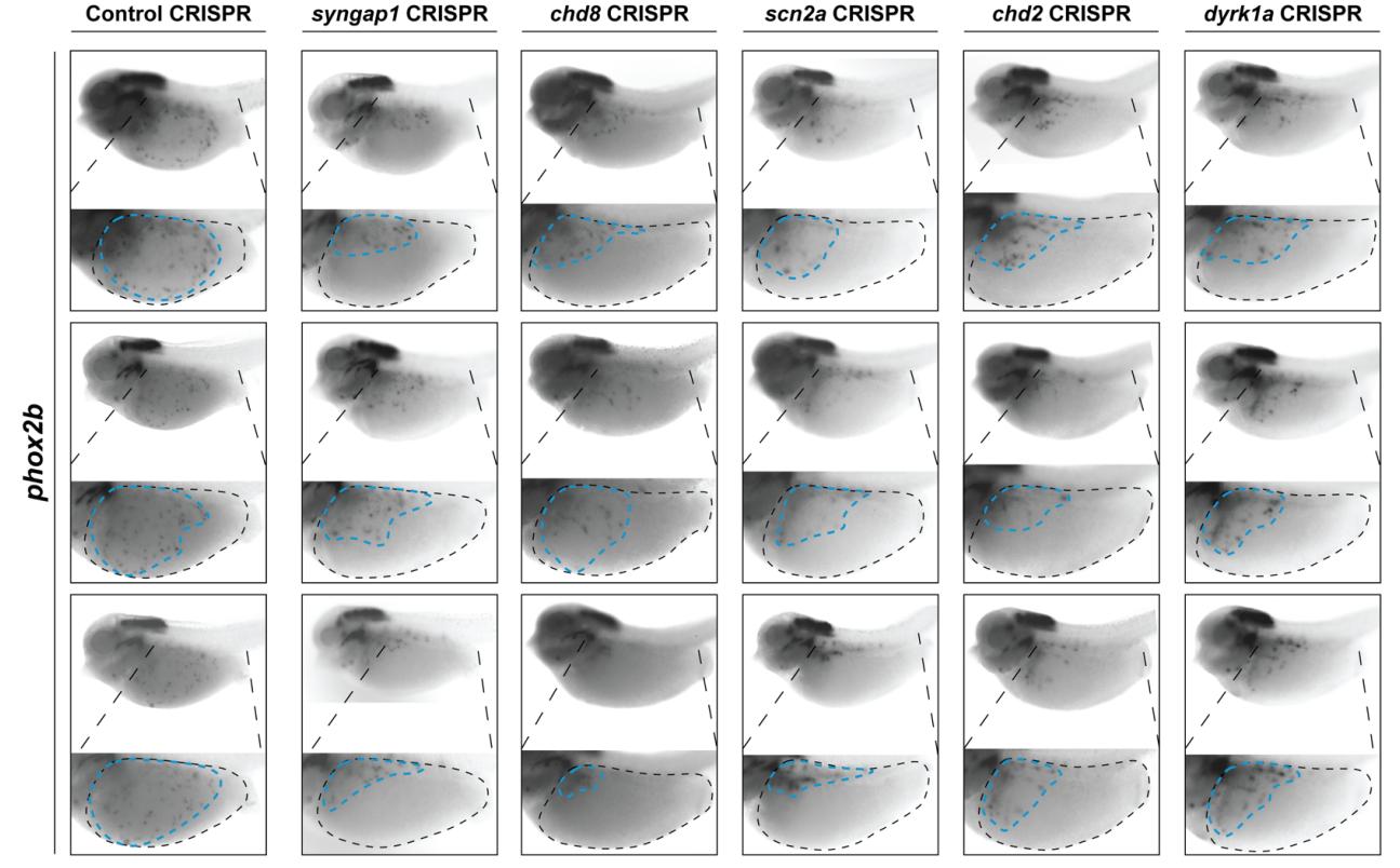 2. CRISPR mutagenesis of hcASD genes syngap1, chd8, scn2a, chd2, or dyrk1a show reduced area of ENCC