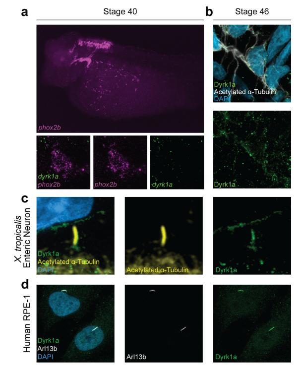 Supplementary Figure 4. dyrk1a is expressed in ENCCs and Dyrk1a localizes to microtubule-based structures. Related to Figure 2. (a) RNA in situ hybridization chain reaction staining shows dyrk1a (green) expression in phox2b-positive (magenta) ENCCs in X. tropicalis, stage 40. Bottom panel shows a high magnification image of dyrk1a mRNA transcripts within a single phox2b-positive cell. (b) Immunofluorescence staining shows Dyrk1a (green) localizing to enteric neuron projections in X. tropicalis as marked by Acetylated alpha-Tubulin (white). (c) Immunofluorescence staining shows Dyrk1a (green) localizing to the primary cilium of an enteric neuron in X. tropicalis as marked by Acetylated alpha-Tubulin (yellow). (d) Immunofluorescence staining shows localization of Dyrk1a (green) to the primary cilium of human retinal pigmented epithelial (RPE-1) cells as marked by Arl13b antibody staining (white).