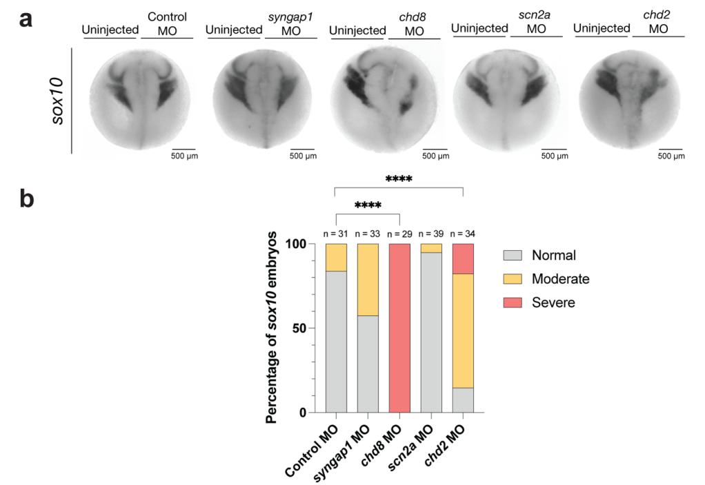 Supplementary Figure 6. hcASD genes chd8 and chd2 are required for neural crest development. (a) Perturbation of hcASD genes syngap1, chd8, scn2a or chd2 in early (NF stage 20) embryos. (b) Proportion of
