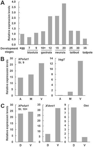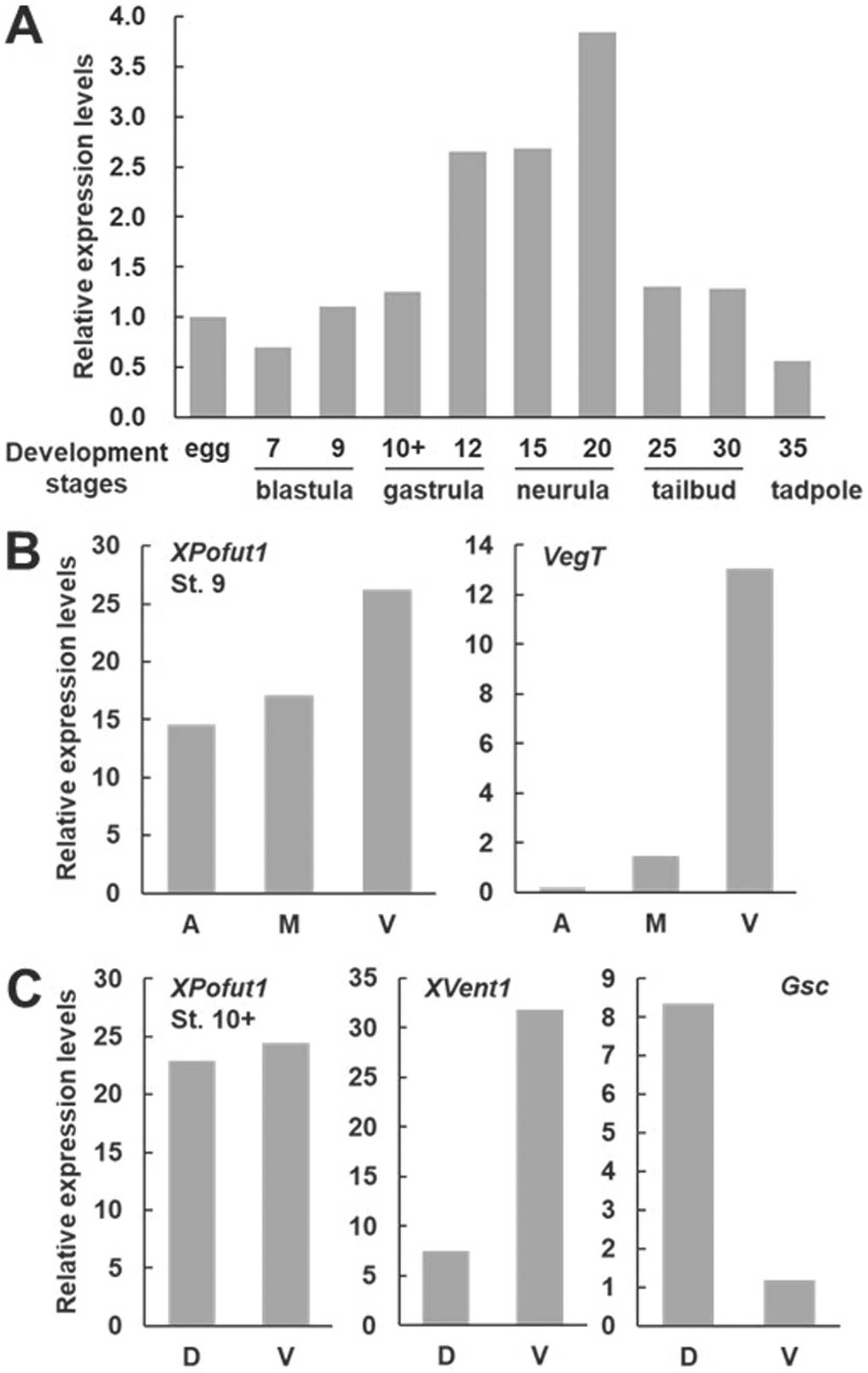 Fig. 1. Expression patterns of XPofut1. Total RNAs from embryos or regions of embryos at indicated stages were isolated, the transcript levels of XPofut1 were analyzed by RT-PCR and normalized with those of EF1. (A) Comparison of the levels of XPofut1 transcripts in unfertilized egg, blastula (stages 7 and 9), gastrula (stages 10+ and 12), neurula (stages 15 and 20), tailbud (stages 25 and 30), and tadpole (stage 35). (B) Stage 9 embryos were divided into the animal (A), marginal (M), and vegetal (V) regions. The levels of VegT (a ventral marker) transcripts are compared to confirm the accuracy of dissection. (C) Stage 10 embryos were divided into the dorsal (D) and vegetal (V) halves. The levels of Gsc (a dorsal marker) and XVent1 (a ventral marker) transcripts are compared to confirm the accuracy of dissection.