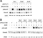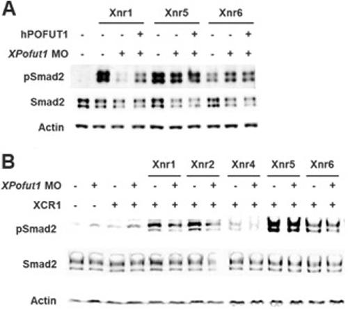 Fig. 6. XPofut1 regulates Xnr1 and Xnr5/6 signaling differently. Embryos were injected with indicated combinations of MO and mRNA. Animal caps were explanted at stage 8.5, cultured until stage 9.5, and harvested to analyze the levels of phosphorylated Smad2 (pSmad2) by immunoblotting. Levels of total Smad2 (Smad2) are also compared and actin is used as a loading control. (A) Embryos were injected into marginal regions with indicated combinations of XPofut1 MO (5 nmole/embryo) and mRNAs encoding Xnr1 (125 pg/embryo), Xnr5 (40 pg/embryo), or Xnr6 (300 pg/embryo) at 2-cell stage, and then injected into 4 animal blastomeres with hPOFUT1 mRNA (100 pg/embryo) at 8-cell stage. (B) Embryos were injected into marginal regions with indicated combinations of XPofut1 MO (5 nmole/embryo) and mRNAs encoding Xnr1 (125 pg/embryo), Xnr2 (20 pg/embryo), Xnr4 (100 pg/embryo), Xnr5 (40 pg/embryo), Xnr6 (300 pg/embryo), or XCR1 (250 pg/embryo) at 2-cell stage.