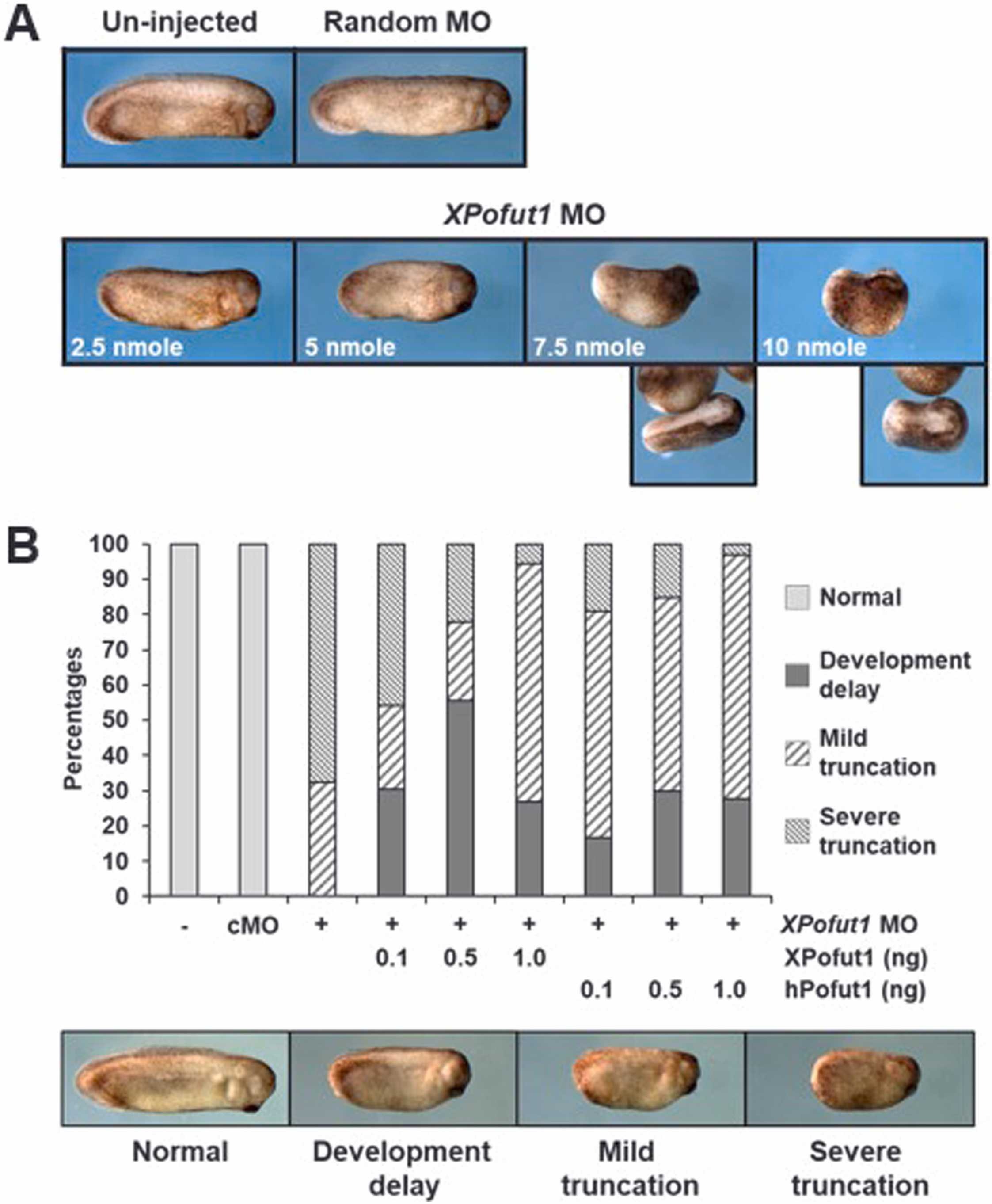Fig. 3. XPofut1 knockdown causes axial truncation. (A) Indicated amounts of XPofut1 (2.5-10nmole/embryo) or control random MO (10nmole/embryo) were injected into the marginal regions at 2-cell stage and the embryos were cultured until stage 27. Photographs of representative embryos are shown. (B) Indicated combinations of XPofut1 or control random MO (cMO) (5nmole/embryo), Sec-hPOFUT1 or Sec-XPofut1 mRNA (ng/embryo) were coinjected into the marginal regions at 2-cell stage. The embryos were cultured until stage 27 and scored for phenotypes. Photographs of representative embryos for each category of phenotype are shown, and percentages of embryos to each category are tabulated.