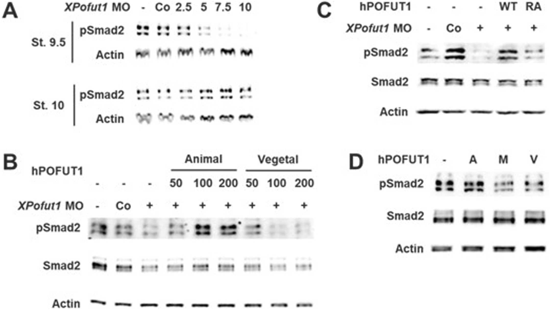 Fig. 5. XPofut1 is important for Smad2 phosphorylation in early embryos. (A) Two-cell-stage embryos were injected into marginal regions with random MO (Co, 10 nmole/embryo) or indicated amounts of XPofut1 MO (nmole/embryo), and cultured until stage 9.5 or 10. The levels of phosphorylated Smad2 (pSmad2) are compared by immunoblotting. Actin is used as loading control. (B-D) Microinjected embryos were cultured until stage 9.5 and harvested to analyze the levels of phosphorylated Smad2 (pSmad2) by immunoblotting. Levels of total Smad2 (Smad2) are also compared and actin is used as a loading control. (B) Random control (Co) or XPofut1 MO (5 nmole/embryo) was injected into marginal regions at 2-cell stage, and then indicated amounts (pg/embryo) of hPOFUT1 mRNA were injected into either 4 animal blastomeres (Animal) or 4 vegetal blastomeres (Vegetal) at 8-cell stage. (C) Random control or XPofut1 MO (5 nmole/embryo) was injected into the marginal region at 2-cell stage, and then mRNA encoding wild-type (WT) or glycosyltransferase-defective mutant form (RA) of hPOFUT1 (100 pg/embryo) was injected into 4 animal blastomeres at 8-cell stage. (D) hPOFUT1 mRNA (100 pg/embryo) was injected into 4 animal blastomeres at 8-cell stage (A), into marginal regions at 2-cell stage (M), or into 4 vegetal blastomeres at 8-cell stage (V).