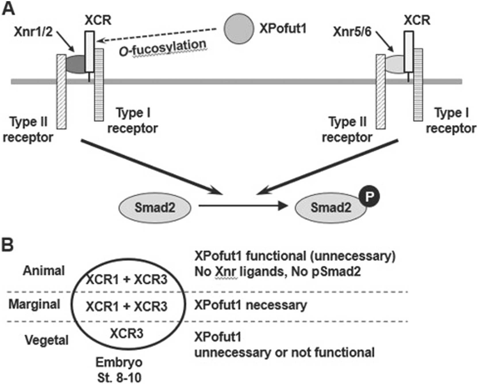 Fig. 7. A schematic model for XPofut1 functional in Xnr signaling. (A) XPofut1 is necessary for Xnr1/2-induced Smad2 phosphorylation. XPofut1 may control Xnr1/2 signaling by O-fucosylation (dashed arrow) of XCRs, the Xenopus laevis EGF-CFC factors. XPofut1 is not necessary for Xnr5/6-induced Smad2 phosphorylation. (B) Spatial pattern of XPofut1 activity and XCR expression in stages 8 to 10 Xenopus laevis embryos. In the vegetal pole region (Vegetal), XPofut1 transcripts are present but XPofut1 function is not necessary for Smad2 phosphorylation. In the marginal zone (Marginal), XPofut1 function is necessary for Smad2 phosphorylation. In the animal cap region (Animal), XPofut1 is functional as shown in animal cap assays (Fig. 6), yet there are no Xnr ligands or Smad2 phosphorylation in this region. See “Discussion” for details.