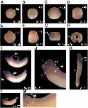 Fig. 2. Spatial expression patterns of XPofut1. Whole-mount in situ hybridization was performed with embryos of indicated stages. Photographs of representative embryos are shown. (A) Stage 12, vegetal view, dorsal side is toward the top. (B-D) Stage 18, anterior view, dorsal side is toward the top (B), lateral view, dorsal side is toward the top (C), and dorsal view, anterior side is toward the top (D). (E and F) Stage 20, anterior view, dorsal side is toward the top (E) and dorsal view, anterior side is toward the top (F). (G and H) Stage 24, lateral view (G), and dorsal view (H). (I-K) Stage 30, lateral view (I), higher magnification of anterior region (J), and dorsal view (K). (L and M) Stage 37, lateral view (L) and higher magnification of dorsal region (M). ap, auditory placode; ba, branchial arch; bp, blastopore; e, eye; mc, mesencephalon, ng, neural groove; np, neural plate; ns, nephrostome; op, optic placode; ov, optic vesicle; pd, pronephric duct; pn, pronephros; pt, pronephric tubule; rc, rhombencephalon; s, somite.