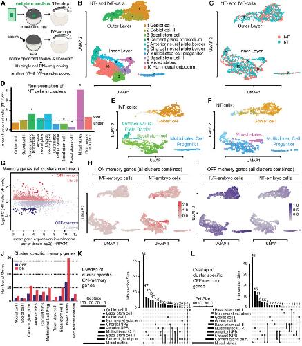 (L) UpSet plot showing the overlap of OFF-memory genes across cell types in NT embryos as described in (K).