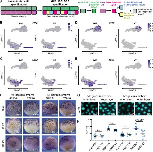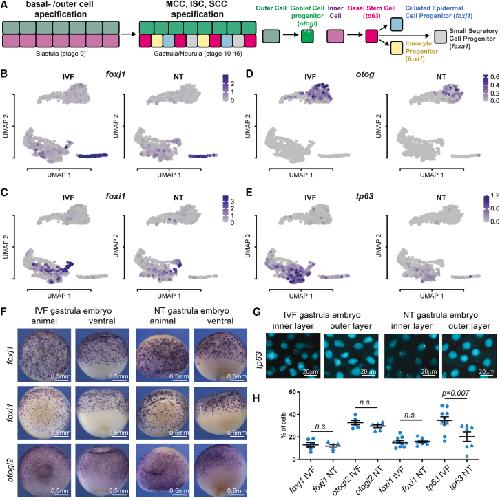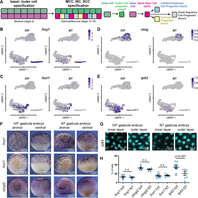 (H) Quantification of (F) and (G); foxj1, IVF n = 5, NT n = 5; for otogl2, IVF n = 8, NT n = 6; for foxi1, IVF n = 10 NT n = 7; for tp63, IVF n = 10, NT n = 7; p value: unpaired t test, lines: mean and standard error of the mean.