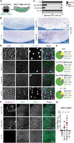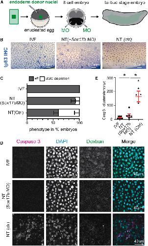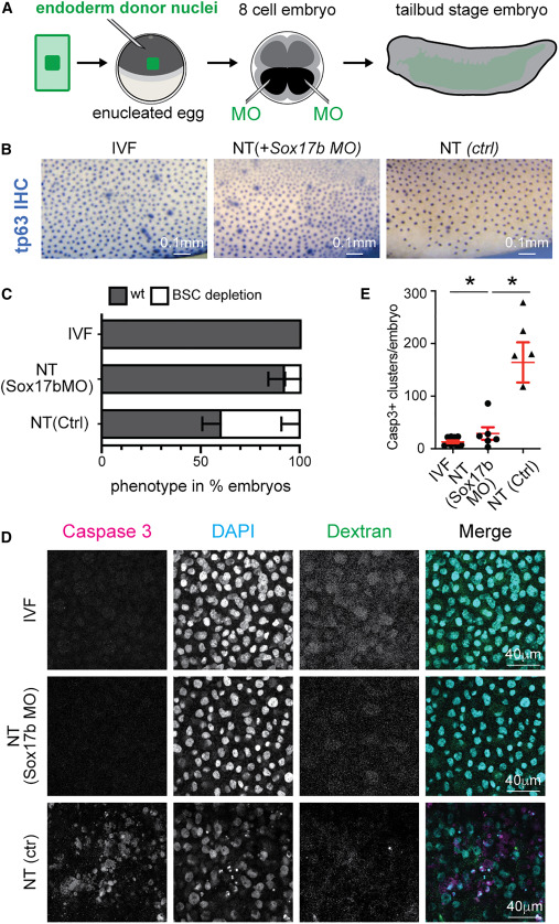 (D) Immunofluorescence for activated caspase-3 (magenta), DAPI (cyan), and fluorescent dextran (green) in IVF and NT embryos injected with control or sox17b morpholino.