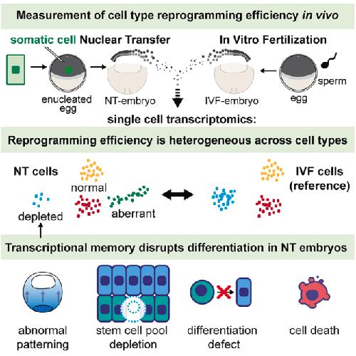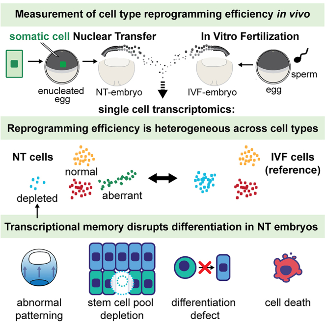 (D) Cell type compositional analyses of scRNA-seq data, each bar representing the mean fraction of NT over IVF cells in each cell cluster. Over, overrepresented in NT embryos; under, underrepresented in NT embryos. ∗ FDR < 10−5 Wald test.