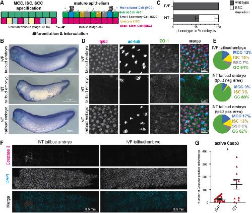 (F) Cleaved caspase-3 (Asp175) IF stainings of NT and IVF embryos at the tailbud stage. Nuclei in cyan (DAPI); cleaved Casp3 in red.