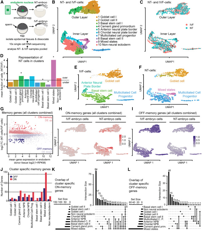 Figure 1. Differentiation defects vary across epidermal cell types and are associated with incomplete transcriptome reprogramming(A) Design of scRNA-seq experiment. Sample size for NT n = 10, and for IVF n = 10.(B and C) (B) UMAP plot of scRNA-seq data from IVF and NT cells colored by cluster (C) or by condition.(D) Cell type compositional analyses of scRNA-seq data, each bar representing the mean fraction of NT over IVF cells in each cell cluster. Over, overrepresented in NT embryos; under, underrepresented in NT embryos. ∗ FDR < 10−5 Wald test.(E) UMAP showing IVF cells colored by terminal state of differentiation computed using CellRank. Colors match cell clusters shown in (B). Darker colors indicate a higher probability of assignment to a terminal state.(F) NT cells analyzed and visualized as described in (E).(G) MA plot comparing gene expression between NT and IVF cells. FC, fold change; RPKM, reads per kilobase per million.(H) UMAP plot of ON-memory gene expression in NT and IVF cells. For each cell, the average of the scaled and centered expression levels of the ON-memory genes is shown.(I) Same as (H), showing expression of OFF-memory genes.(J) Bar plot displaying counts of ON- and OFF-memory genes in epidermal cell types of NT embryos.(K) UpSet plot showing the overlap of ON-memory genes across cell types in NT embryos. Horizontal bar plot: number of ON-memory genes detected in each cell type. Vertical bar plot: number of intersected genes between cell states. Connected dots represent overlap. NPB, neural plate border.(L) UpSet plot showing the overlap of OFF-memory genes across cell types in NT embryos as described in (K).