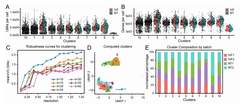 and NT. (B) Number of genes identified per cell for each cluster. Coloured by condition IVF and NT. (C) Variation of Information (VI)