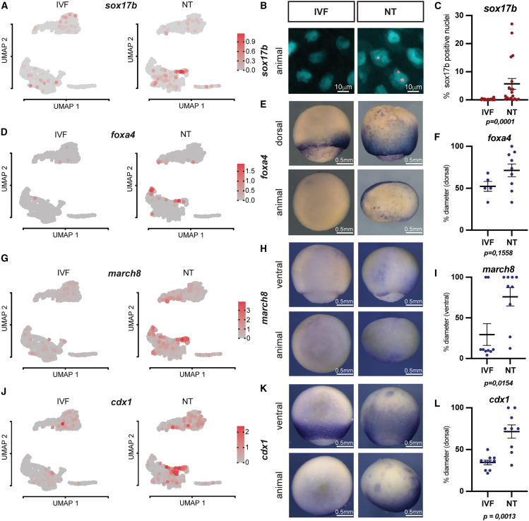 Figure 2. Endoderm gene expression domains expand into ectoderm regions in cloned embryos(A, D, G, and J) sox17b, foxa4, march8, and cdx1 expression in UMAP plots.(B) Fluorescence in situ hybridization against sox17b in NT and IVF epithelia; cyan: nuclei (DAPI); red: sox17b probe (Cy5).(C) Quantification of (B).(E, H, and K) Representative images of IVF and NT st12 embryos stained by whole-mount in situ hybridization with foxa4, march8, and cdx1 antisense RNA probes.(F, I, and L) Quantification of (E), (H), and (K). Per embryo, the ratio of the signal length from dorsal blastopore to animal-vegetal axis diameter was calculated; numbers of embryos for foxa4 staining: IVF n = 5, NT n = 9; for march8: IVF n = 9, NT n = 9; for cdx1: IVF n = 10, NT n = 9; p values: unpaired t test;mean and standard error of the mean.