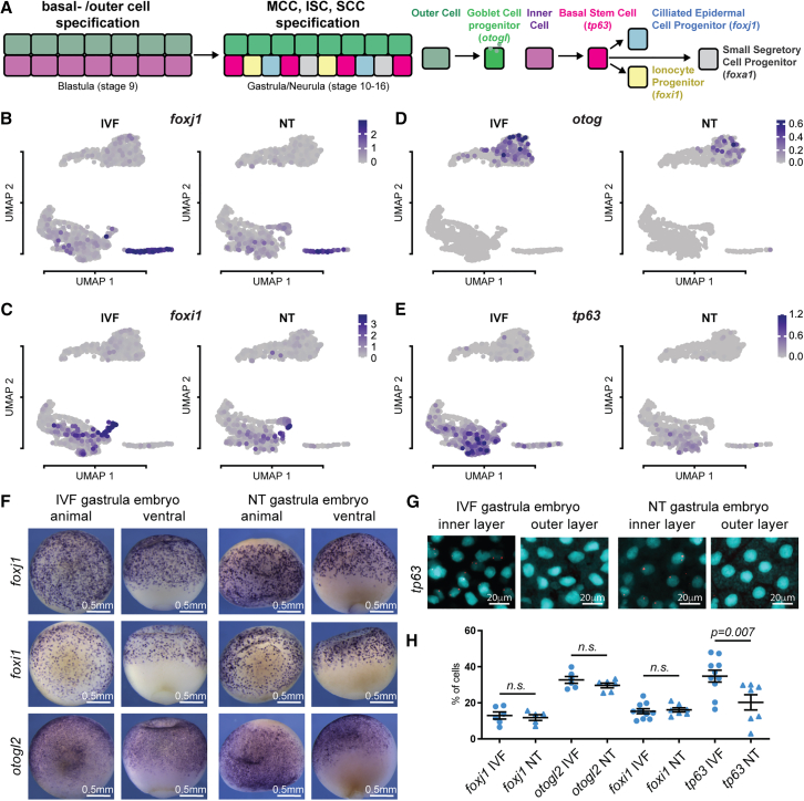 Figure 3. Basal stem cell numbers are reduced in cloned embryos(A) Schematic of cell type specification in mucociliary epidermis.(B–E) Expression levels of foxj1, foxi1, otog, and tp63 in UMAP plots.(F) IVF and NT embryo (st12) whole-mount in situ hybridization with foxj1, foxi1, and otogl2 antisense RNA probes.(G) IVF and NT epithelia (st12) fluorescence in situ hybridization against tp63 transcript in stage 12 embryos; cyan, nuclei (DAPI); red, sox17b probe (Cy5); scale bar, 20 μm.(H) Quantification of (F) and (G); foxj1, IVF n = 5, NT n = 5; for otogl2, IVF n = 8, NT n = 6; for foxi1, IVF n = 10 NT n = 7; for tp63, IVF n = 10, NT n = 7; p value: unpaired t test, lines: mean and standard error of the mean.