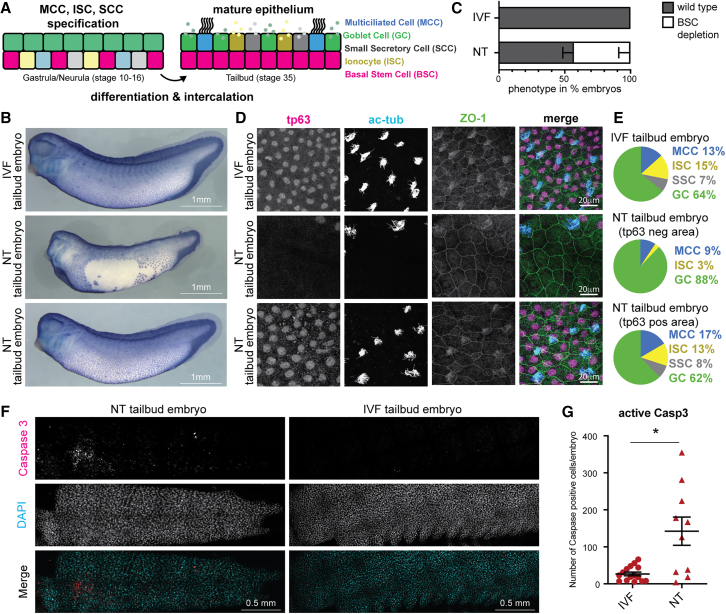 Figure 4. Basal stem cell loss and defective mature epidermis coincide with increased cell death in cloned embryos(A) Schematic of mucociliary epidermis.(B) IVF and NT embryos stained by whole-mount immunohistochemistry against Tp63; scale bar, 1 mm.(C) Proportions of NT (n = 28) and IVF embryos (n = 30) with loss of Tp63-positive basal stem cells (BSCs) in the epidermis of 4 independent experiments.(D) Tp63-positive BSCs and α-ac-tubulin-positive multiciliated cells in immunofluorescence (IF) staining of epidermis in NT and IVF embryos. Anti-ZO-1 (tight junction protein): cell borders.(E) Epidermal cell types in IVF and NT embryos. Data represent mean values from IF stainings in (D) and data not shown. IVF (n = 7), NT Tp63-negative area (n = 5), and NT Tp63-positive area (n = 5).(F) Cleaved caspase-3 (Asp175) IF stainings of NT and IVF embryos at the tailbud stage. Nuclei in cyan (DAPI); cleaved Casp3 in red.(G) Quantification of (F). NT (n = 10) and IVF (n = 15).∗p < 0.01, unpaired t test; lines: mean and standard error of the mean.