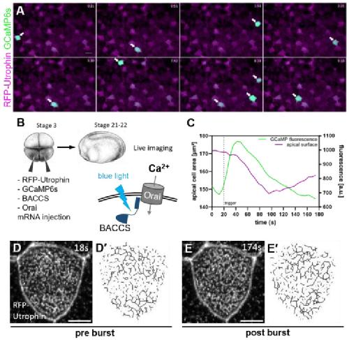Figure 1. Calcium bursts in MCCs cause apical contraction and changes to the apical actin network: (A) Calcium bursts occur regularly in MCCs during the development of the Xenopus epidermis (arrows). Stills of a movie recorded over 10 min (20 frames/minute) of a stage 21–22 embryo with actin (RFP-Utrophin, magenta) and calcium (GCaMP6s, green) labels. Scale bar 20 µm. (B) Setup for experimental induction of calcium bursts in MCCs. Targeted activation of BACCS by blue light causes Ca2+-influx through Orai channels. Xenopus illustrations © Natalya Zahn (2022), xenbase.org RRID:SCR_003280 [28]. (C–E) Effects of stimulated calcium bursts on MCCs in a representative cell. (C) Graph of GCaMP fluorescence and apical surface of an MCC during an optogenetically induced calcium burst. (D,E) Maximum intensity projections of apical actin labeled by RFP-Utrophin in a developing MCC before and after an induced calcium burst. (D’,E’) Skeletonized actin derived from the confocal images. Scale bars 5 µm.