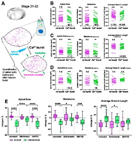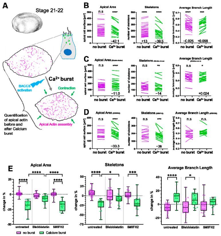 Figure 2. Actin network assembly in response to calcium bursts in MCCs: (A) Scheme: At stages 21–22, MCCs expressing BACCS components were recorded for 180 s. BACCS was activated to induce a calcium burst, resulting in apical contraction (green arrows) Apical area and the apical actin network were quantified and compared between a pre- and a post-burst timepoint. Xenopus illustrations © Natalya Zahn (2022) [28]. (B–D) Changes to the apical area and the actin network (number of skeletons, average branch length) in MCCs with and without calcium burst. (B) Untreated embryos, (C) Blebbistatin, (D) SMIFH2. Cells were recorded for 180 s and a calcium burst was induced after 12 s. Magenta lines show values for individual cells without a calcium burst, green lines for those with an induced calcium burst; end-points indicate the pre- and post-burst values. Statistical test: Wilcoxon matched pairs signed rank test. * p < 0.05; ** p < 0.01; *** p < 0.001; **** p < 0.0001; n.s. not significant. For significant changes, the median change is included in the graph. Mean and SD values are provided in Table S1. (E) Comparison of changes to the apical area and the actin network (number of skeletons, average branch length) between MCCs with and without calcium activity both for untreated, Blebbistatin-treated, and SMIFH2-treated embryos. Graphs show the changes presented in (B–D) in percent. Each data point represents an individual cell. Box and whiskers indicate quartiles. Dashed line indicates 0% (no change). Averages and SD: Apical Area (Untreated, no burst: +1.2 ± 3.5%; calcium burst: −19.3 ± 10.0%; Blebbistatin, no burst: −1.7 ± 3.9%; calcium burst: −7.5 ± 6.1%; SMIFH2, no burst: −0.3 ± 4.4%; calcium burst: −18.3 ± 8.1%). Skeleton number (Untreated, no burst: +8.1 ± 10.5%; calcium burst: −23.9 ± 15.8%; Blebbistatin, no burst: +1.6 ± 17.5%; calcium burst: −8.7 ± 11.5%; SMIFH2, no burst: +2.2 ± 10.1%; calcium burst: −18.9 ± 17.1%). Average branch length (Untreated, no burst: −5.7 ± 6.8%; calcium burst: +11.7 ± 10.0%; Blebbistatin, no burst: −4.1 ± 11.8%; calcium burst: +6.0 ± 9.0%; SMIFH2, no burst: −1.2 ± 11.0%; calcium burst: +2.2 ± 7.1%). Statistical test: 2-way ANOVA + Tukey’s multiple comparisons test. * p < 0.05; ** p < 0.01; *** p < 0.001; **** p < 0.0001; non-significant comparisons are not shown; 53 cells from 30 untreated embryos; 41 cells from 14 Blebbistatin-treated embryos; 39 cells from 18 SMIFH2-treated embryos.