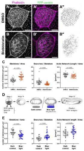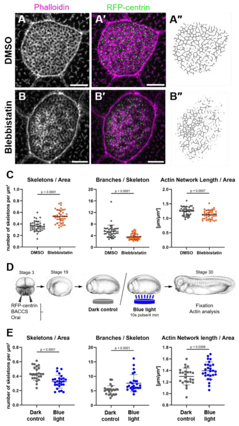 Figure 3. Non-muscle myosin II and recurring calcium bursts drive apical actin network development: (A–C) Maximum intensity projections of apical actin in MCCs of embryos treated with (A) DMSO or (B) 50 µM Blebbistatin from stage 19 to 30. (A’,B’) show actin labeled by phalloidin in magenta, and GFP-centrin-labeled basal bodies in green. Scale bars 5 µm. (A’’,B’’) show the skeletonized actin network. (C) Quantification of the apical actin network of MCCs in embryos treated with DMSO or Blebbistatin. Number of skeletons (separate actin structures) per µm2 (DMSO 0.36 ± 0.09; Blebbistatin 0.53 ± 0.11). Average branches per skeleton (DMSO 5.5 ± 2.2; Blebbistatin 3.6 ± 1.0). Length of the apical actin network normalized to surface area (DMSO 1.25 ± 0.15 µm−1; Blebbistatin 1.13 ± 0.15 µm−1). Error bars show mean and SD; 39 cells from 12 to 13 embryos analyzed per condition. Statistical test: Mann–Whitney Test (D,E) Effect of repeated induction of calcium bursts. (D) Experimental setup: Embryos expressing BACCS and Orai were grown in darkness or with 10 s pulses of 450 nm light every 4 min from stage 19 to 30. Xenopus illustrations © Natalya Zahn (2022) [28]. (E) Quantification of MCC apical actin: Number of skeletons per µm2 (Dark 0.44 ± 0.09; Blue 0.33 ± 0.09). Average branches per skeleton (Dark 5.2 ± 1.6; Blue 7.7 ± 3.0). Length of the apical actin network normalized to surface area (Dark 1.30 ± 0.15 µm−1; Blue 1.40 ± 0.15 µm−1). Error bars show mean and SD; 24–27 cells from 8 to 9 embryos analyzed per condition. Statistical test: Mann–Whitney Test.