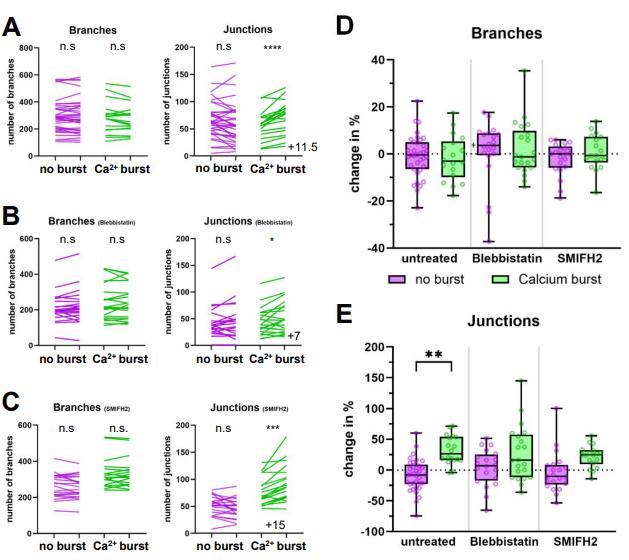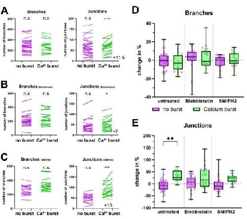 +0.8±7.4%). Junction number (Untreated, no burst: -8.2±26.2%; calcium burst: