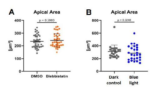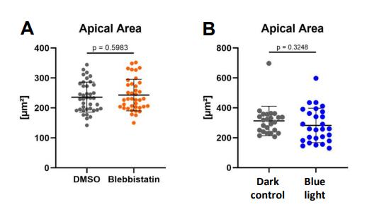 Blebbistatin treatment (DMSO 236.1±50.2µm²; Blebbistatin 243.1±52.9µm²). This
