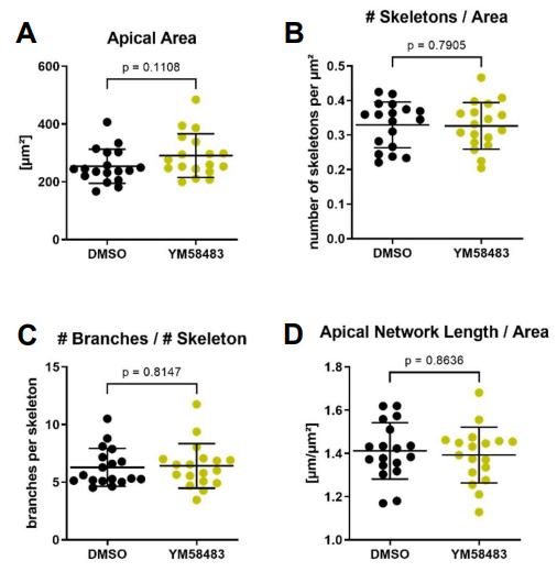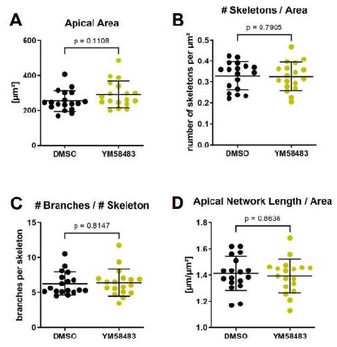 area (DMSO 253.8±59.0µm²; YM58483 290.9±75.5µm²). (B) Number of skeletons