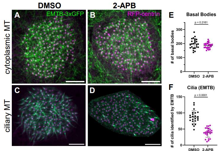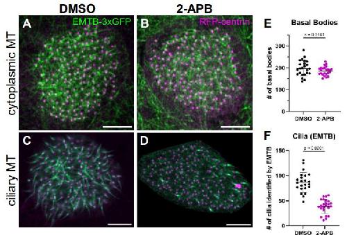 ciliary bases labeled by EMTB-3xGFP in MCCs treated with DMSO (86±20) or 2-