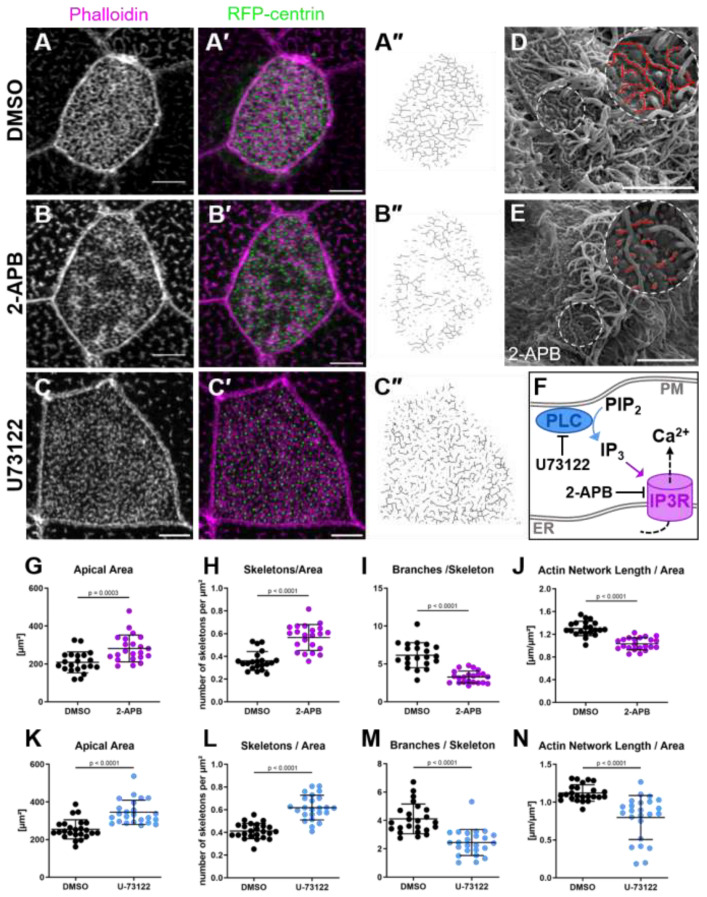 Figure 4. Inhibition of IP3R and PLC leads to truncation of the apical actin network and microridges: (A–C) Maximum intensity projections of apical actin in MCCs of embryos treated with (A) DMSO, (B) 2-APB, or (C) U73122 from stage 19 to 30. (A’–C’) show actin labeled by phalloidin in magenta, and RFP-centrin-labeled basal bodies in green. (A’’–C’’) show the skeletonized actin network. Scale bars 5 µm. (D,E) Scanning electron micrographs of MCCs on the surfaces of embryos treated with (D) DMSO or (E) 2-APB. Microridges were manually labeled red in magnified insets (dashed circles). Scale bar 5 µm. (F) Scheme illustrating the interactions of small molecule inhibitors 2-APB and U73122 with the IP3-calcium pathway. IP3, inositol 1,4,5-triphosphate; IP3R, inositol triphosphate receptor; PIP2, phosphatidylinositol 4,5-bisphosphate; PLC, phospholipase C; PM, plasma membrane; ER, endoplasmic reticulum membrane. (G–J) Quantification of apical surface area and the apical actin network of MCCs in embryos treated with DMSO or 2-APB. (G) Apical surface area (DMSO: 208.5 ± 55.4 µm2; 2-APB: 282.4 ± 71.0 µm2). (H) Number of skeletons (separate actin structures) per µm2 (DMSO: 0.36 ± 0.08; 2-APB: 0.57 ± 0.11). (I) Average branches per skeleton (DMSO: 6.2 ± 1.7; 2-APB: 3.3 ± 0.8). (J) Length of the apical actin network normalized to surface area (DMSO: 1.30 ± 0.13 µm−1; 2-APB: 1.03 ± 0.11 µm−1). (K–N) Quantification of apical surface area and the apical actin network of MCCs in embryos treated with DMSO or U73122. (K) Apical surface area (DMSO 254.3 ± 51.2 µm2; U73122 344.9 ± 64.5 µm2). (L) Number of skeletons (separate actin structures) per µm2 (DMSO 0.41 ± 0.07; U73122 0.62 ± 0.11). (M) Average branches per skeleton (DMSO 4.1 ± 1.1; U73122 2.4 ± 0.9). (N) Length of the apical actin network normalized to surface area (DMSO 1.12 ± 0.11 µm−1; U73122 0.80 ± 0.29 µm−1). Error bars show mean and SD; 21–24 cells from 6 to 8 embryos analyzed per condition. Statistical test: Mann–Whitney Test.