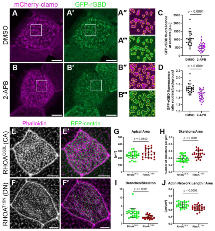 Figure 6. Inhibition of IP3R disrupts the apical actin network by interfering with local activation of RhoA: (A–D) Active RhoA (GFP-rGBD, green, A’,B’) localizes to the anterior rootlet (mCherry-clamp, magenta) of basal bodies in MCCs of control embryos treated with DMSO from stage 19 to 24 (Maximum intensity projections). Boxed areas are magnified in (A’’,A’’’,B’’,B’’’). Yellow outlines in magnified areas indicate basal body rootlets. Scale bars 5 µm. (C) Graph comparing the average fluorescence intensity (a.u.) within the yellow outlines in (A’’’,B’’’) between DMSO and 2-APB treatments. (DMSO: 1043 ± 410; 2-APB: 548 ± 237). (D) Rootlet/cell background ratio of GFP-rGBD fluorescence compared between DMSO and 2-APB treatments. (DMSO: 1.67 ± 0.14; 2-APB: 1.48 ± 0.14); 24–30 cells from 8 embryos analyzed per condition. Statistical test: Mann–Whitney Test. (E,F) Maximum intensity projections of apical actin in MCCs expressing (E) GFP-RHOAQ63L or (F) GFP-RHOAT19N. (E’,F’) show actin labeled by phalloidin in magenta, and RFP-centrin-labeled basal bodies in green. Scale bars 5 µm. (G–J) Quantification of the apical surface area and the apical actin network of MCCs expressing GFP-RHOAQ63L or GFP-RHOAT19N. (G) Apical area (RHOAQ63L 239.5 ± 49.7 µm2; RHOAT19N 272.83 ± 64.1 µm2). (H) Number of skeletons (separate actin structures) per µm2 (RHOAQ63L 0.38 ± 0.10; RHOAT19N 0.52 ± 0.10). (I) Average branches per skeleton (RHOAQ63L 4.9 ± 2.1; RHOAT19N 3.0 ± 0.9). (J) Length of the apical actin network normalized to surface area (RHOAQ63L 1.09 ± 0.15 µm−1; RHOAT19N 0.91 ± 0.15 µm−1). Error bars show mean and SD; 24–27 cells from 8 embryos analyzed per condition. Statistical test: Mann–Whitney Test.