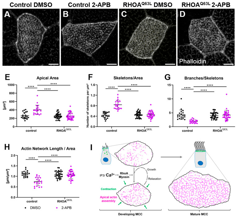 Figure 7. Apical actin truncation due to IP3R inhibition is rescued by constitutively active RhoA: (A–H) Maximum intensity projections of apical actin and quantification thereof in MCCs treated with DMSO or 2-APB and expressing constitutively active RHOAQ63L. Scale bars 5 µm. (E) Apical surface area (DMSO control: 263.3 ± 78.2 µm2; 2-APB control: 402.1 ± 112.2 µm2; DMSO RHOAQ63L: 255.5 ± 65.6 µm2; 2-APB RHOAQ63L: 254.5 ± 79.7 µm2). (F) Number of skeletons (separate actin structures) per µm2 (DMSO control: 0.44 ± 0.11; 2-APB control: 0.84 ± 0.17; DMSO RHOAQ63L: 0.46 ± 0.10; 2-APB RHOAQ63L: 0.46 ± 0.12). (G) Average branches per skeleton (DMSO control: 4.3 ± 1.7; 2-APB control: 1.9 ± 0.6; DMSO RHOAQ63L: 4.1 ± 1.1; 2-APB RHOAQ63L: 4.2 ± 1.7). (H) Length of the apical actin network normalized to surface area (DMSO control: 1.12 ± 0.13 µm−1; 2-APB control: 0.75 ± 0.20 µm−1; DMSO RHOAQ63L: 1.09 ± 0.16 µm−1; 2-APB RHOAQ63L: 1.07 ± 0.18 µm−1). Error bars show mean and SD; 31–51 cells from 10 to 16 embryos analyzed per condition. Statistical test: 2-way ANOVA + Tukey’s multiple comparisons test. **** p < 0.0001. (I) Model depicting the role of calcium, myosin, and RhoA in the maturation of the apical actin network. Green arrows symbolize the apical contraction following a calcium burst. Apical actin is depicted skeletonized in pink.