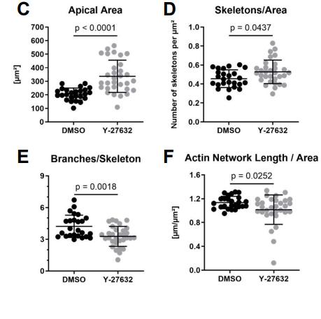 actin structures) per µm² (DMSO 0.46±0.09; Y-27632 0.53±0.12). (E) Average