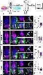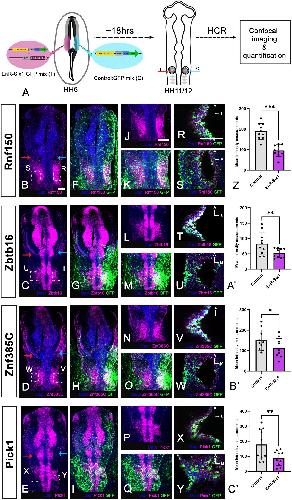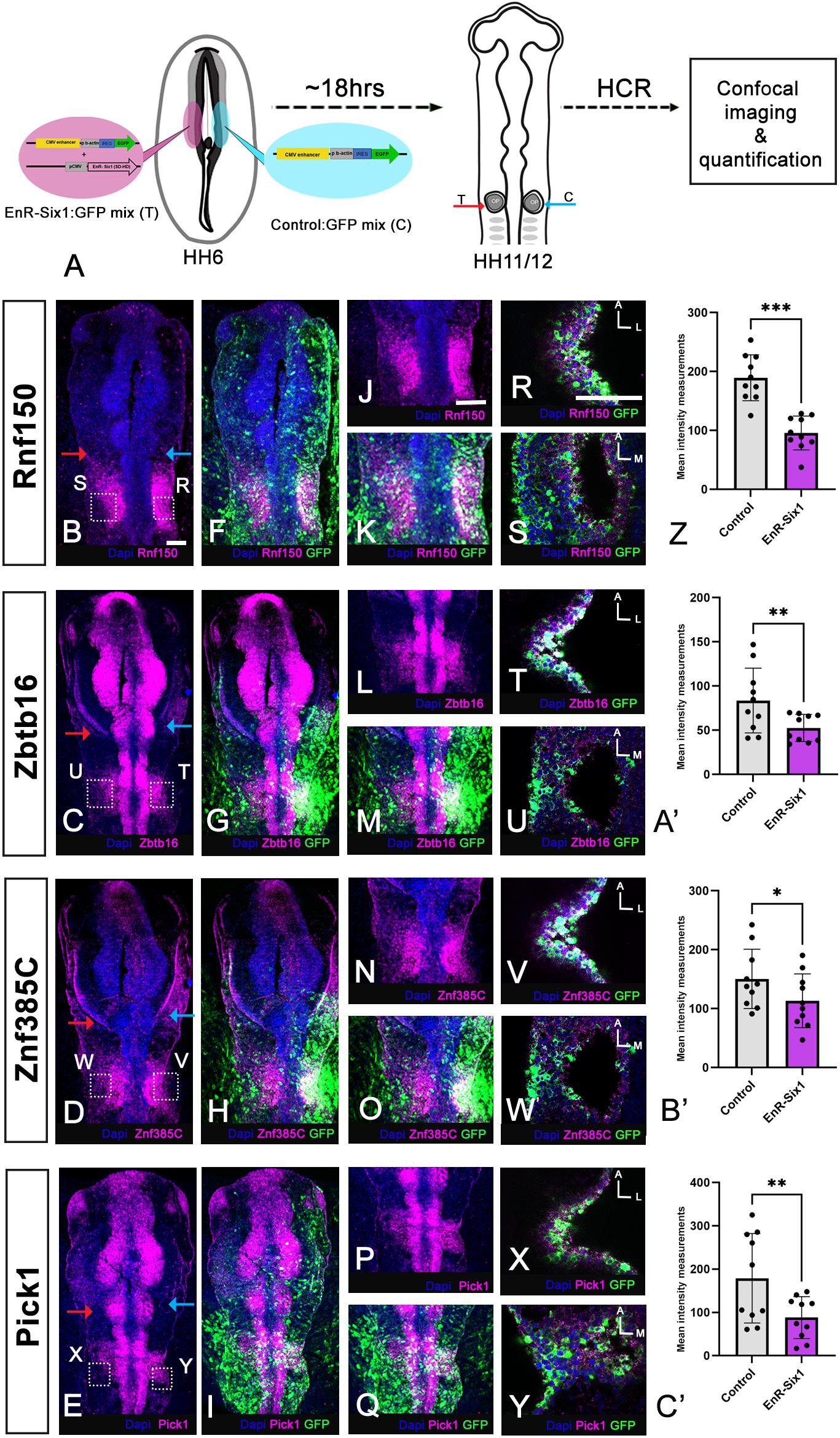 Fig. 4.Six1 regulates putative target gene expression in chick. (A) Experimental design: EnR-Six1 and eGFP vectors were electroporated on one side of HH6/7 embryos (pink) and control eGFP vectors (blue) on the other. Embryos were grown until they reached HH11-12, and processed for HCR in situ hybridisation and imaging. (B-E) Whole-mount HCR in situ hybridisation for Rnf150 (B), Zbtb16 (C), Znf385c (D) and Pick1 (E) in magenta; nuclei are stained using DAPI (blue). (F-I) Embryos in B-E with eGFP channel to visualise EnR-Six1 (left side of the embryo) and control GFP (right side of the embryo). The images shown in C,G and D,H represent the same embryo that was processed for double HCR in situ hybridisation. (J-Q) Higher magnifications of the otic placode territory of embryos shown in B-I. (R-Y) The outlined areas in B-E are imaged at a higher magnification and single confocal slices of these regions are shown. HCR signal is in magenta; GFP is in green. (Z-C′) Quantification of fluorescent gene expression signals on the control and experimental side. Dots indicate individual data points; data are mean±s.e.m.; *P<0.05, **P<0.01, ***P<0.001 (paired Student's t-test). Scale bars: 100 µm (bar in B applies to B-I; bar in J applies to J-Q; bar in R applies to R-Y).