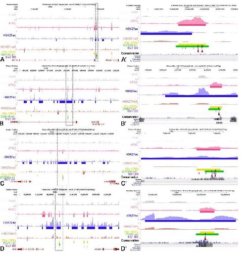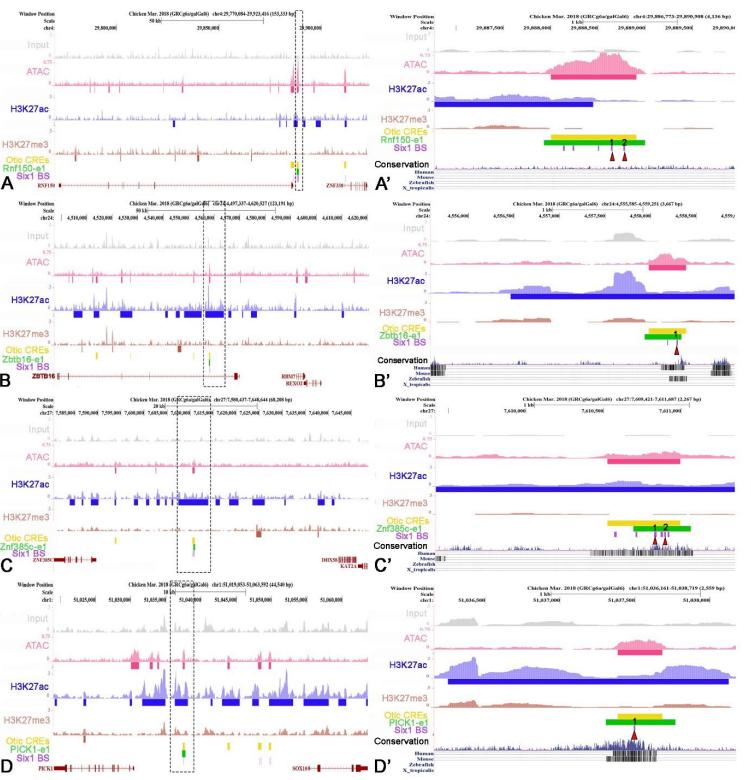 RNF150 (A), Zbtb16 (B), Znf385c (C) and Pick1 (D). A’-D’ show zoomed in views of the genomic track of