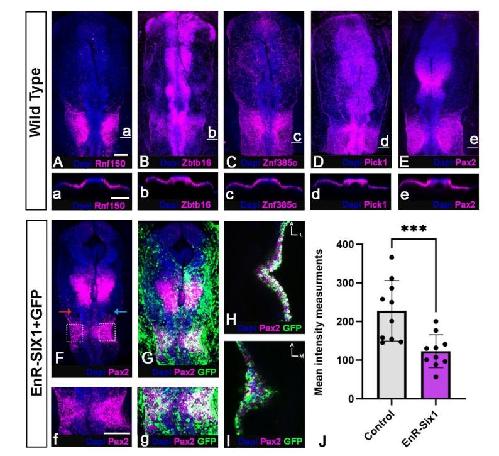 situ HCR. a-e show sections at the level of the white line in A-E. F-J: Six1 activity is required for