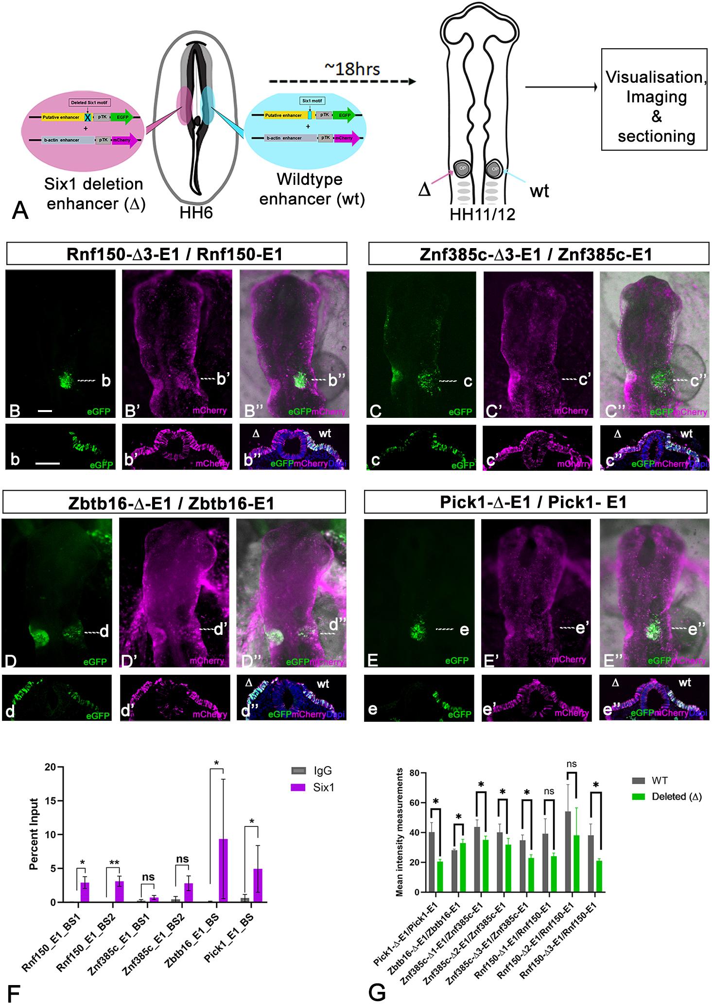 Fig. 2.Six1 occupies and regulates enhancer activity in the chick otic placode. (A) Experimental strategy for bilateral electroporation of HH6/7 chick embryos with wild-type reporter constructs (right, blue) and eGFP reporters with the Six1 motif deleted (left, pink); each construct was co-electroporated with ubiquitously active mCherry. Embryos were assessed for enhancer activity at HH11-12. (B-B″) Rnf150-E1 activity in the otic placode with corresponding sections shown in b-b″; deletion of both Six1-binding sites (BSs) (Rnf150-Δ3-E1) leads to loss of enhancer activity (n=6). (C-C″) Znf385c-E1 activity in the otic placode with corresponding sections shown in c-c″; deletion of both Six1 motifs (Znf385c-Δ3-E1) leads to decreased enhancer activity (n=6). (D-D″) Zbtb16-E1 activity is moderate in the otic placode; corresponding sections shown in d-d″; Six1 motif deletion (Zbtb16-Δ-E1) leads to increased enhancer activity (n=5). (E-E″) Pick1-E1 activity in the otic placode with corresponding sections shown in e-e″; Six1 motif deletion (Pick1-Δ-E1) leads to reduced enhancer activity (n=4). Dashed white lines in B-E″ indicate the levels of sections shown in b-e″. Scale bars: 100 µm. (F) ChIP using Six1 and IgG control antibodies was performed on dissected chick otic placodes followed by qPCR for the enhancers indicated on the x-axis. *P≤0.05, **P≤0.01; ns, not significant; P≤0.09 for Znf385cBS1 and P≤0.08 for Znf385cBS2 (paired Student's t-test). Data are mean±s.e.m. (G) Quantification of GFP intensity as a proxy for enhancer activity in the otic placode before and after Six1 motif deletion. *P≤0.05 (paired Student's t-test). Data are mean±s.e.m.