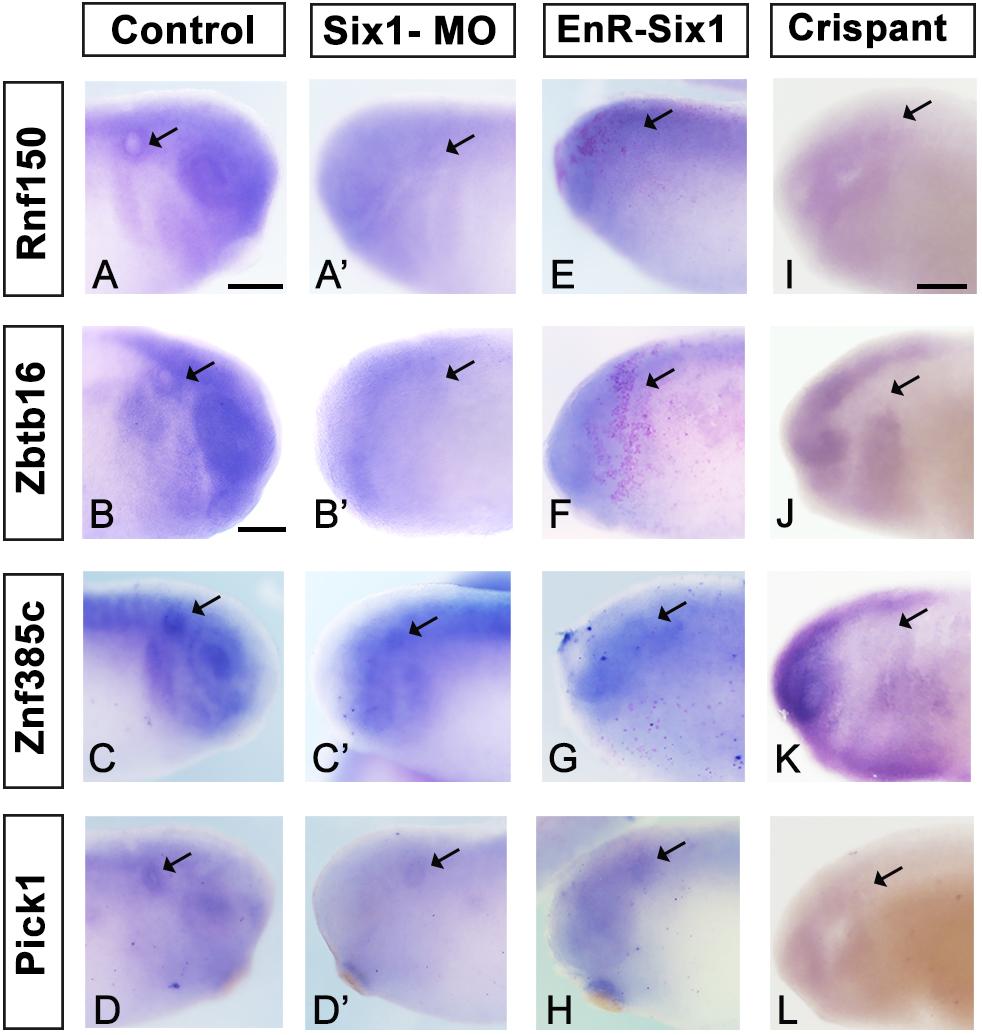 Fig. 3.Six1 is required for the expression of putative target genes. (A-D′) Rnf150 (A), Zbtb16 (B), Znf385c (C) and Pick1 (D) are expressed in the otic vesicle on the control side of Xenopus laevis larvae (A-D, arrows), but their expression is greatly reduced on the Six1 MO-injected side of the same embryo (A′-D′, arrows). (E-H) Injection of mRNA encoding EnR-Six1 into Xenopus laevis embryos leads to loss of the expression of all four genes; pink indicates lineage tracer demarking the injected side of the larva. (I-L) Six1 loss-of-function in Xenopus tropicalis F0 mutants created by CRISPR-Cas9 (Coppenrath et al., 2021) leads to loss of Rnf150 (n=15) (I), Zbtb16 (n=6) (J), Znf385c (n=12) (K) and Pick1 (n=16) (L) expression in the otic vesicle (arrows). Scale bars: in A, 400 µm for A,C-H,A′,Cʹ,D′; in B, 400 µm in B,Bʹ; in I, 200 µm for I-L.