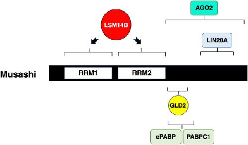 Fig. 6. Schematic interaction map of characterized Musashi co-associated proteins. The relative domains on Musashi responsible for interaction with AGO2, LIN28A, GLD2, ePABP, PABPC1 and LSM14B are shown. LSM14B is currently the only characterized protein that interacts exclusively with the N-terminal domain of Musashi.