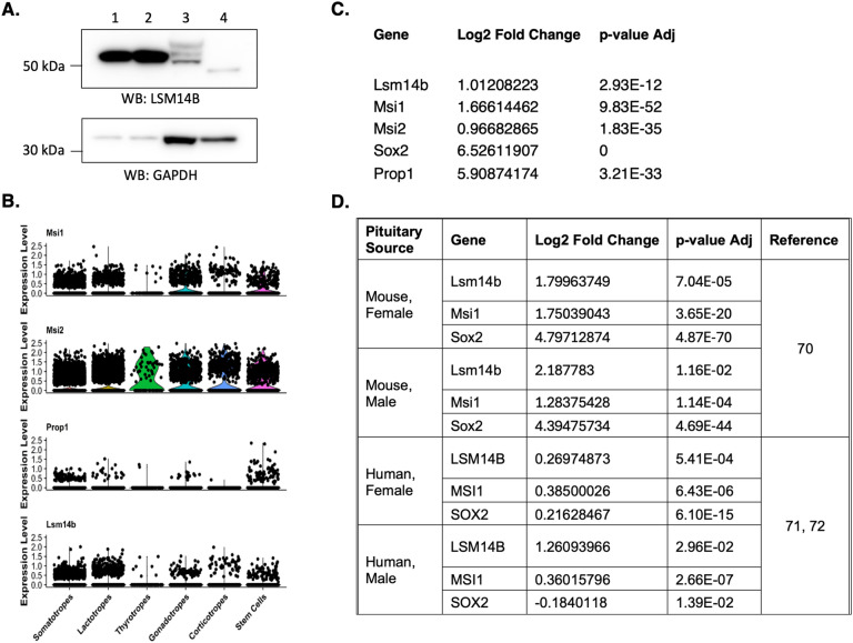 Fig. 4. LSM14B is expressed in the murine pituitary. (A) Protein lysates were prepared from Immature (lane 1) or mature (lane 2) Xenopus oocytes, murine NIH3T3 cells (lane 3) or mouse pituitary (lane 4) and analyzed by western blotting for LSM14B (WB:LSM14B) or GAPDH (WB:GAPDH) as an internal loading control. (B) Reanalysis of published scRNA-seq datasets reveals co-expression of Musashi1 (MSI1), Musashi2 (MSI2), Prop1 (PROP1) and Lsm14b (LSM14B) in Sox2 stem cells and across all pituitary endocrine cell lineages in the male mouse. (C) Differential expressed gene analysis of the same data shown in (B) reveals statistically significant enrichment of Lsm14b, Msi1, Msi2, Prop1 together in the Sox2 cell cluster. (D) Differential expressed gene analysis of additional male and female mouse and human pediatric pituitaries reveals statistically significant enrichment of Lsm14B and Musashi1 within the same cell cluster.