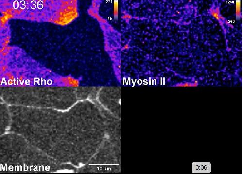Video S1. Active Rho and myosin II accumulate near the cytokinetic furrow in neighbor cells, related to Figure 1A. Time-lapse confocal imaging of active Rho (GFP-rGBD, top left), Myosin II (Sf9-mCherry, top right), and membrane (CellMask Deep Red, bottom left) in cells neighboring a dividing cell. Lookup table scales are indicated as shown. Time shown in minutes:seconds. Playback at 10 fps.