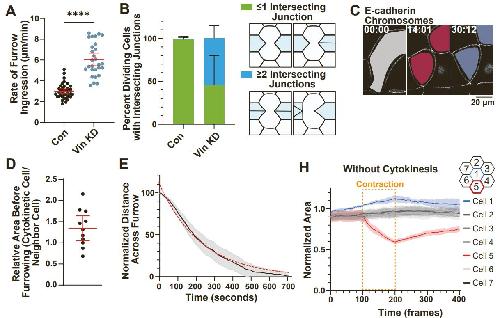 Vinculin knockdown, n = 28 cells across 8 embryos. B) Quantification of the percentage of dividing