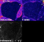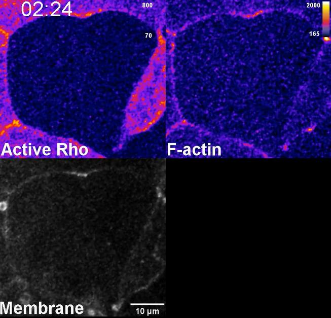 Video S2. Active Rho and F-actin accumulate near the cytokinetic furrow in neighbor cells, related to Figure 1C. Time-lapse confocal imaging of active Rho (GFP-rGBD, top left), F-actin (LifeAct-RFP, top right), and membrane (CellMask Deep Red, bottom left) in cells neighboring a dividing cell. Lookup table scales are indicated as shown. Time shown in minutes:seconds. Playback at 10fps.