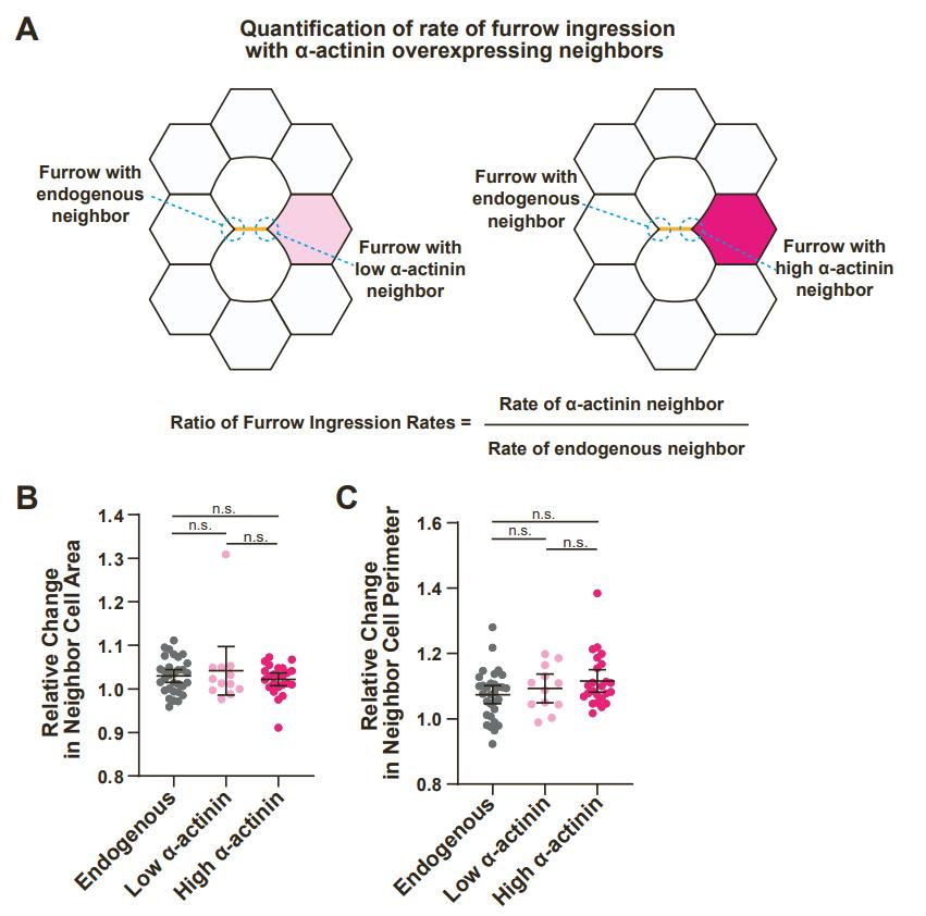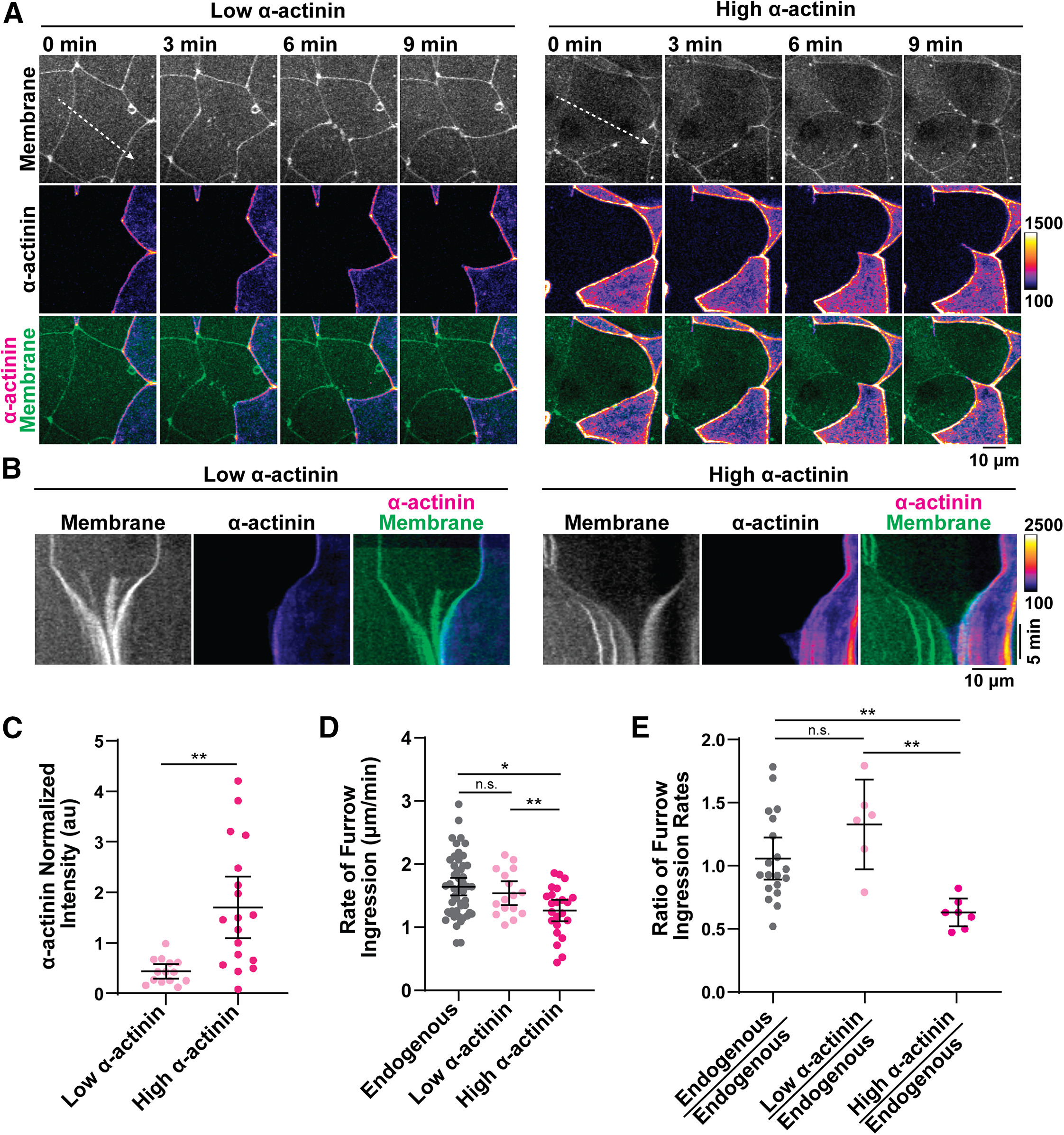 (A) Time-lapse confocal imaging of cytokinesis with neighbors overexpressing low or high levels of GFP-ɑ-actinin and stained with membrane dye (CellMask Deep Red).